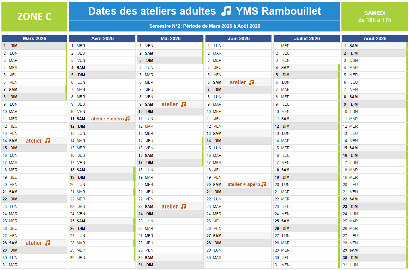 Dates des ateliers musicaux adultes du second semestre, de mars à juin 2026 :